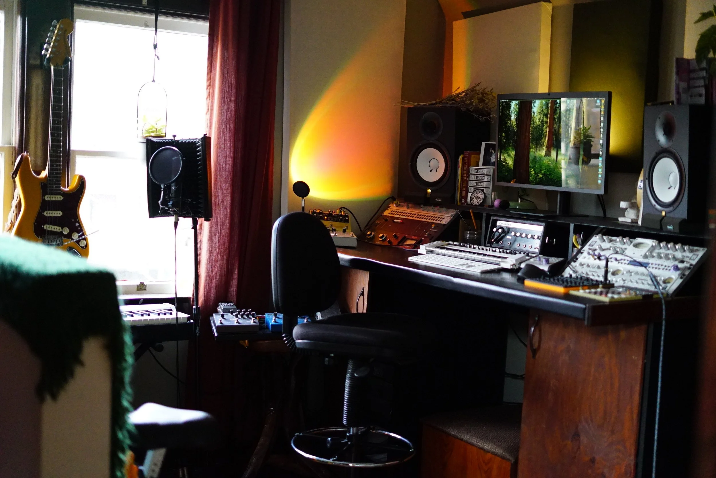 In East Van, I work out of two dedicated studios designed for different stages of the creative process. The first is our “live” room, ideal for recording drums and full-band sessions. It’s stocked with a classic collection of guitar amps, guitars, and basses to suit a variety of tones and styles. Upstairs, the overdub and mixing studio offers a wide range of tools for shaping and layering sounds, including keyboards, synths, drum machines, and unique effect processors from makers like Strymon, Chase Bliss, and Hologram Electronics. Together, these spaces provide the flexibility to capture raw performances and sculpt them into finished productions.